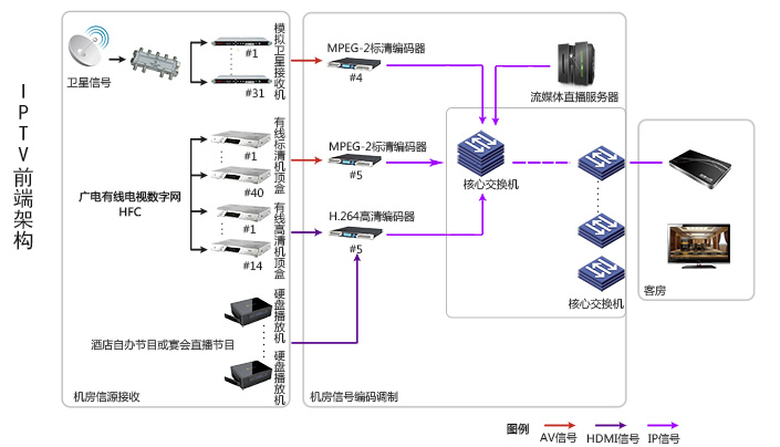 1、对于广电有线数字信号,在机房用当地有线的机顶盒对广电信号进行解调、解密、解码,输出AV(标清)信号或HDMI(高清)信号,然后再经过编码、调制后传入酒店Intranet网络,经流媒体服务器分发广播到客房。