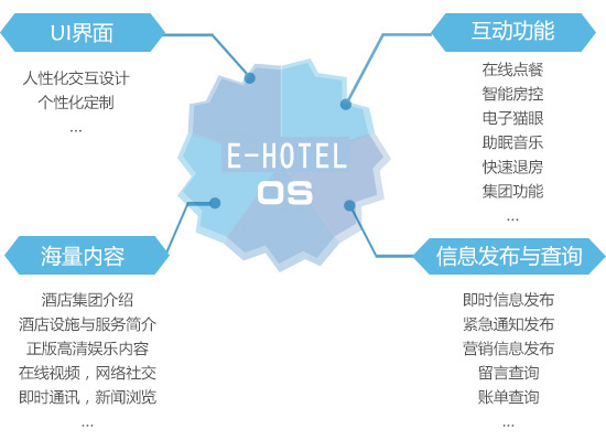 智能化的服务,好用的酒店智能电视操作系统 “E-Hotel”OS是针对酒店及宾客对于智能化需求而基于Android平台深度开发的新一代酒店智能电视操作系统。系统全面集成了信息服务、娱乐服务及客房互动服务功能,可完美搭载于现今国内外主流电视厂商智能电视上,帮助酒店轻松实现智慧客房升级,使宾客在使用智能电视的同时,体验到酒店真挚的待客之道。
