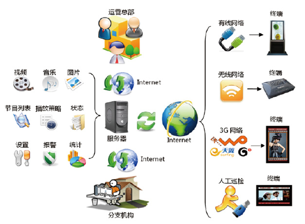 信息发布与查询系统是一套依托有线、无线或3G网络,采用先进的数字编解码和传输技术,软、硬件相结合的系统。系统以前瞻性、拓展性、先进性及实用性为设计思路,采用集中控制,统一管理的方式,将视频、音频、图片和滚动字幕、天气预报、实时新闻等多媒体信息通过网络平台传输到显示终端,并最终以高品质的数字信号播出。